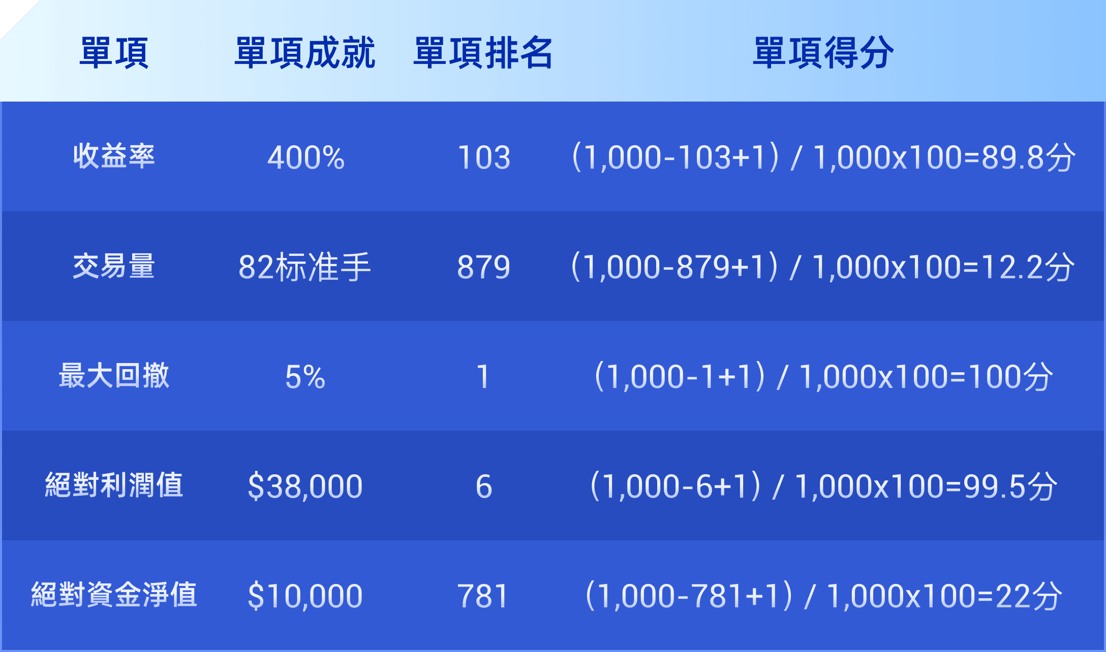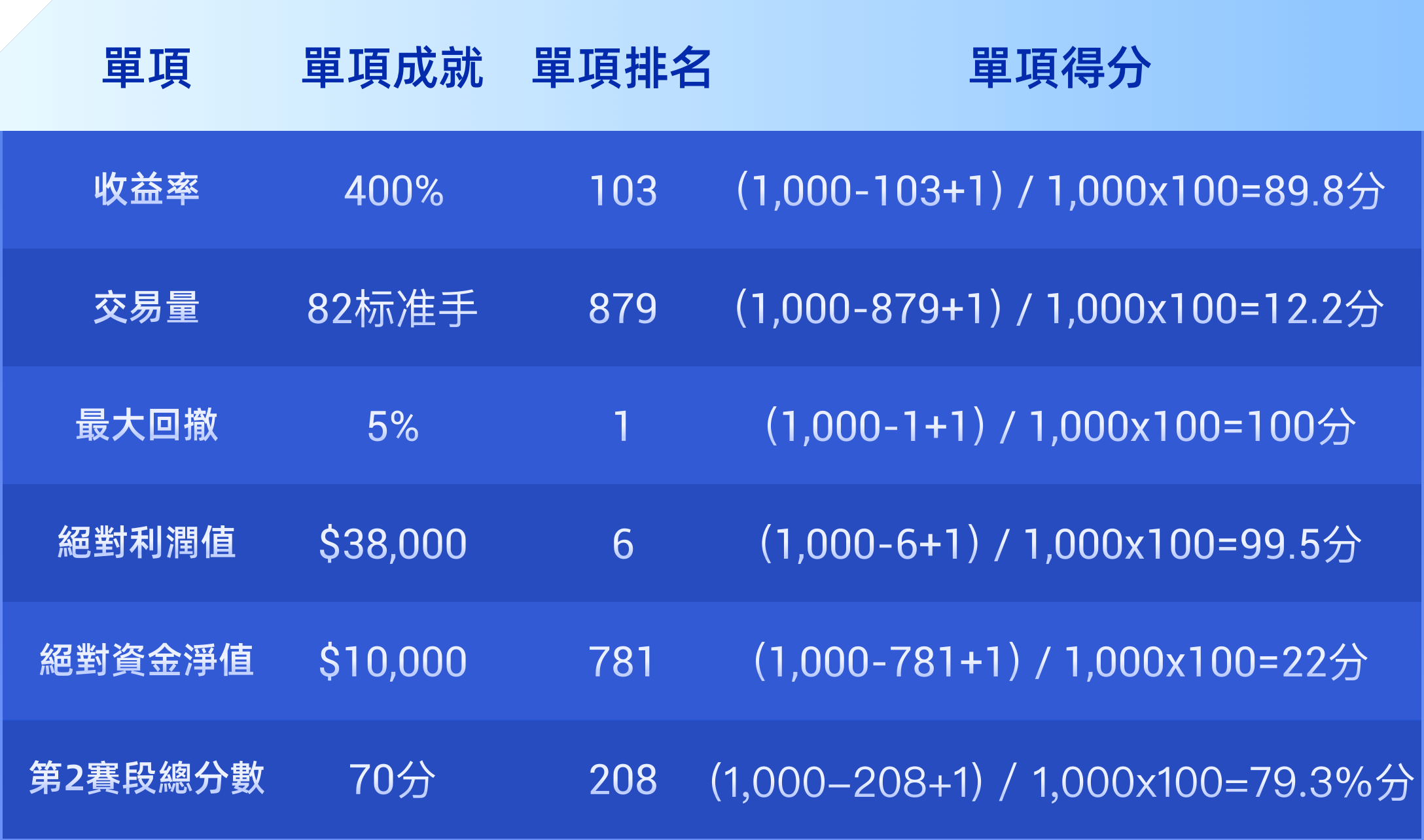 總參賽帳戶數量為1000個,而A客戶的參賽帳戶成績如下: